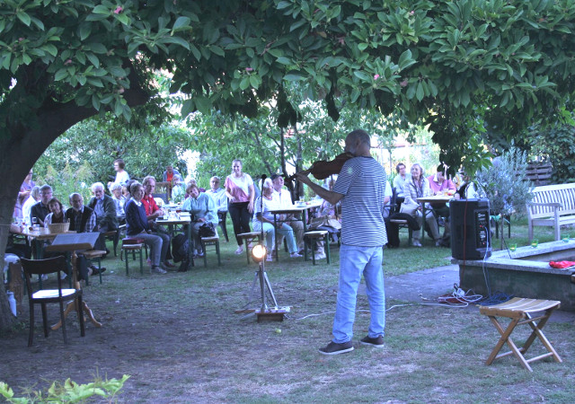 Passend zur Dämmerung präsentierte das Apunti Ensemble im Franziskusgarten des ehemaligen Kapuzinerklosteres in Dieburg Auszüge aus seinem Programm "Moritaten und Küchenlieder". Das begeisterte Publikum genoss ein unterhaltsames Stündchen bei einem guten Schoppen und forderte etliche Zugaben.